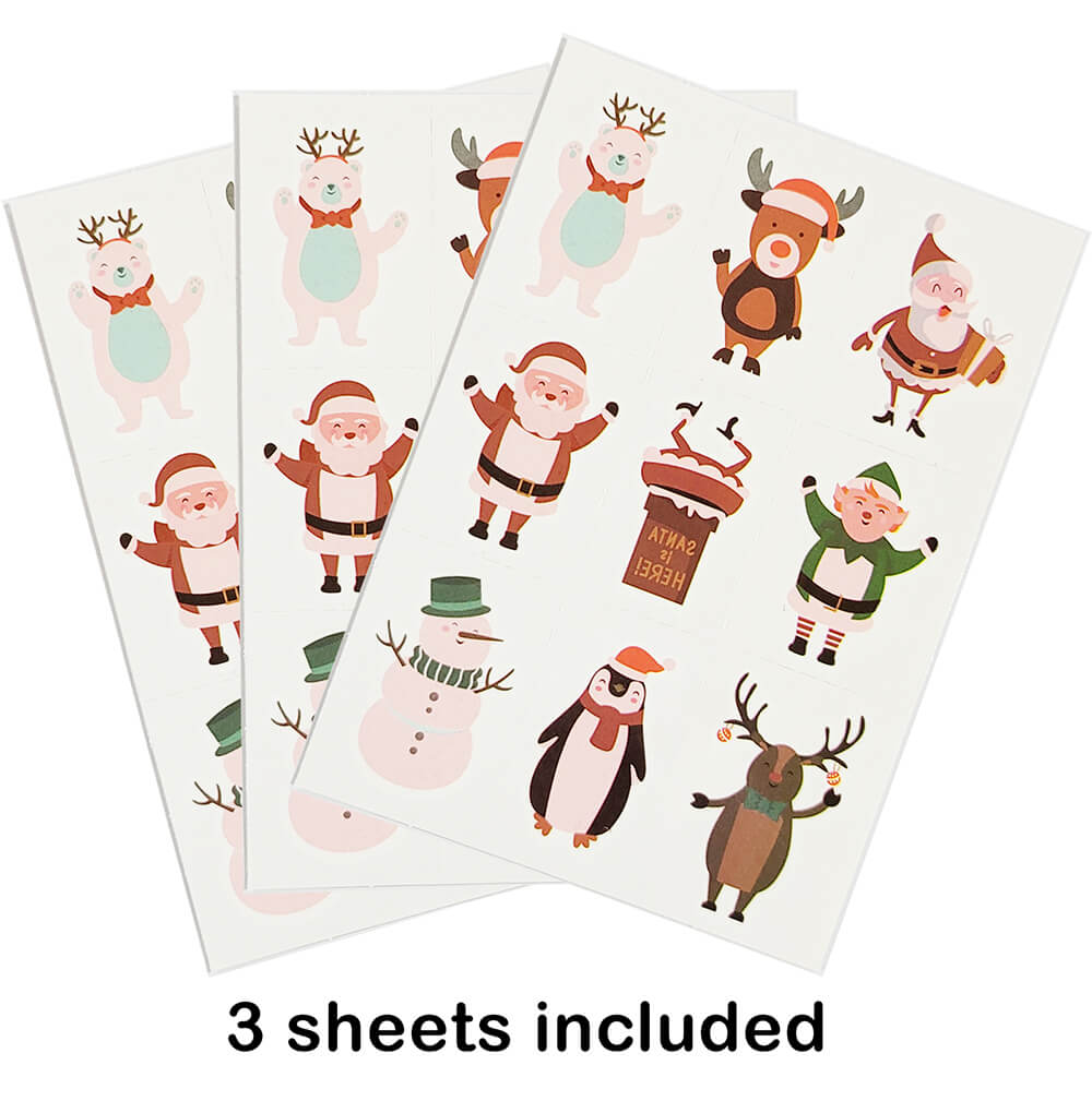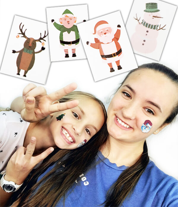 Six fun Christmas tattoos per sheet for your child to put on their face or arms. Add some shine during snow days and Christmas time with these yuletide tattoos! Girls and boys love wearing these snowmen, elves, reindeer and other seasonal skin art styles on their hands, faces and arms! Easy to stick on and remove. Non-toxic.