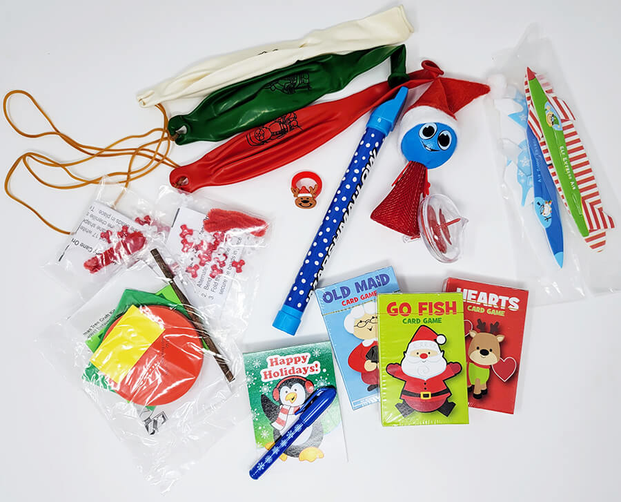 This cute stocking stuffer bundle will bring excitement to your kids when they find in their stockings 3 sets of Christmas style playing cards, 3 jumbo bouncing balloons, an elf hopper that hops 4 ft high, 2 foam airplane kits, a marshmallow shooter, a spinning top, a reindeer ring, an activity booklet with a pen, a Christmas tree craft and 2 candy cane crafts!